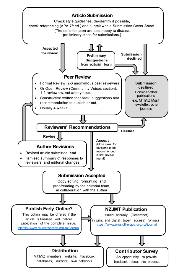 Authors and reviewers are asked to consider the relevance of their work to contemporary music therapy practice in Aotearoa New Zealand. The journal publishes only original material, except where reprint rights have been sought for an article of particular relevance to music therapy practice here. Articles declined by the journal may be recommended for publication elsewhere, e.g. Music Therapy New Zealand’s MusT newsletter.